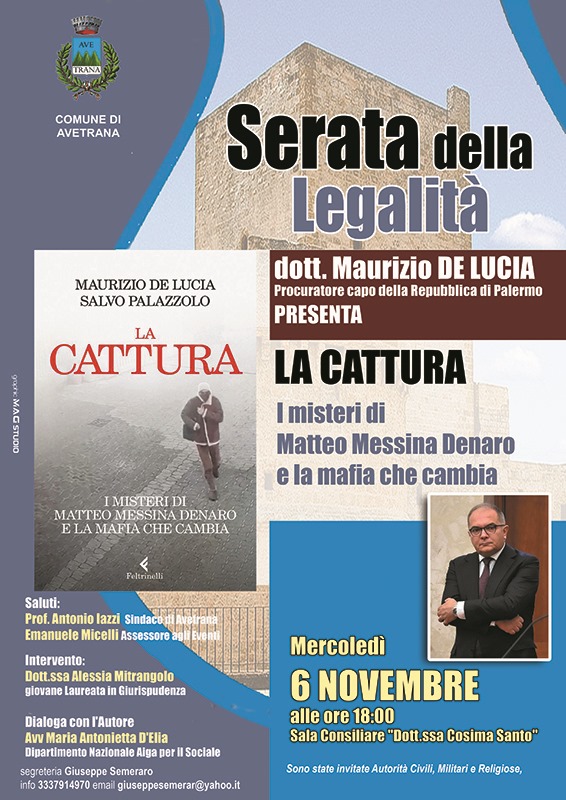 L’Amministrazione comunale di Avetrana, guidata dal sindaco Antonio Iazzi, con il supporto dell’assessore agli Eventi Emanuele Micelli, ha organizzato per mercoledì 6 novembre, dalle ore 18, presso l’aula consiliare “Dott.ssa Cosima Santo”, la Serata della Legalità. Interverrà il Procuratore Capo della Repubblica di Palermo Maurizio De Lucia, autore del libro “La cattura – I misteri di Matteo Messina Denaro e la mafia cha cambia”. Maurizio De Lucia ha coordinato le indagini per l’arresto di Matteo Messina Denaro, prelevato da una clinica di Palermo dopo trent’anni di latitanza.