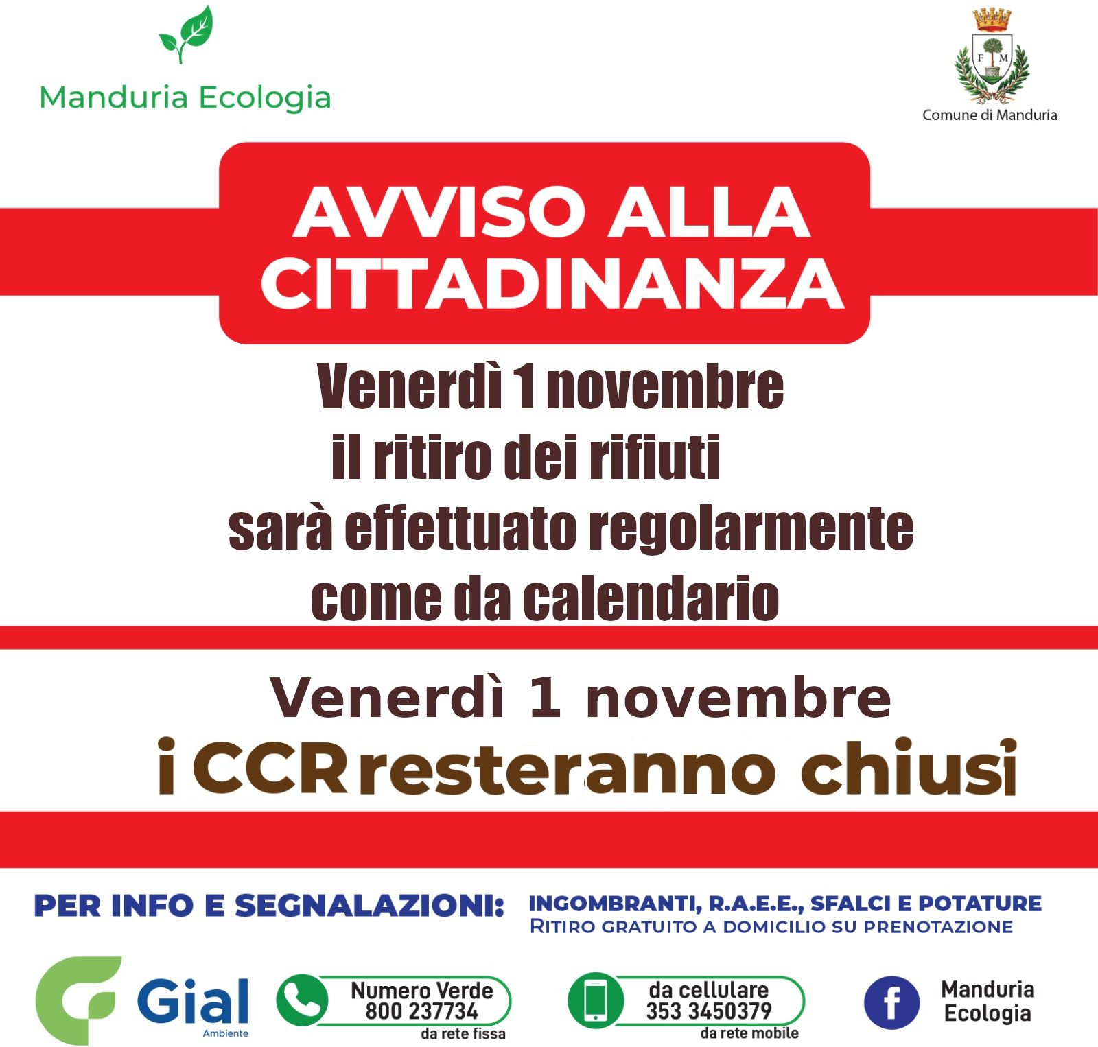 Domani mattina (1 novembre) il servizio di raccolta dei rifiuti sarà volto regolarmente.