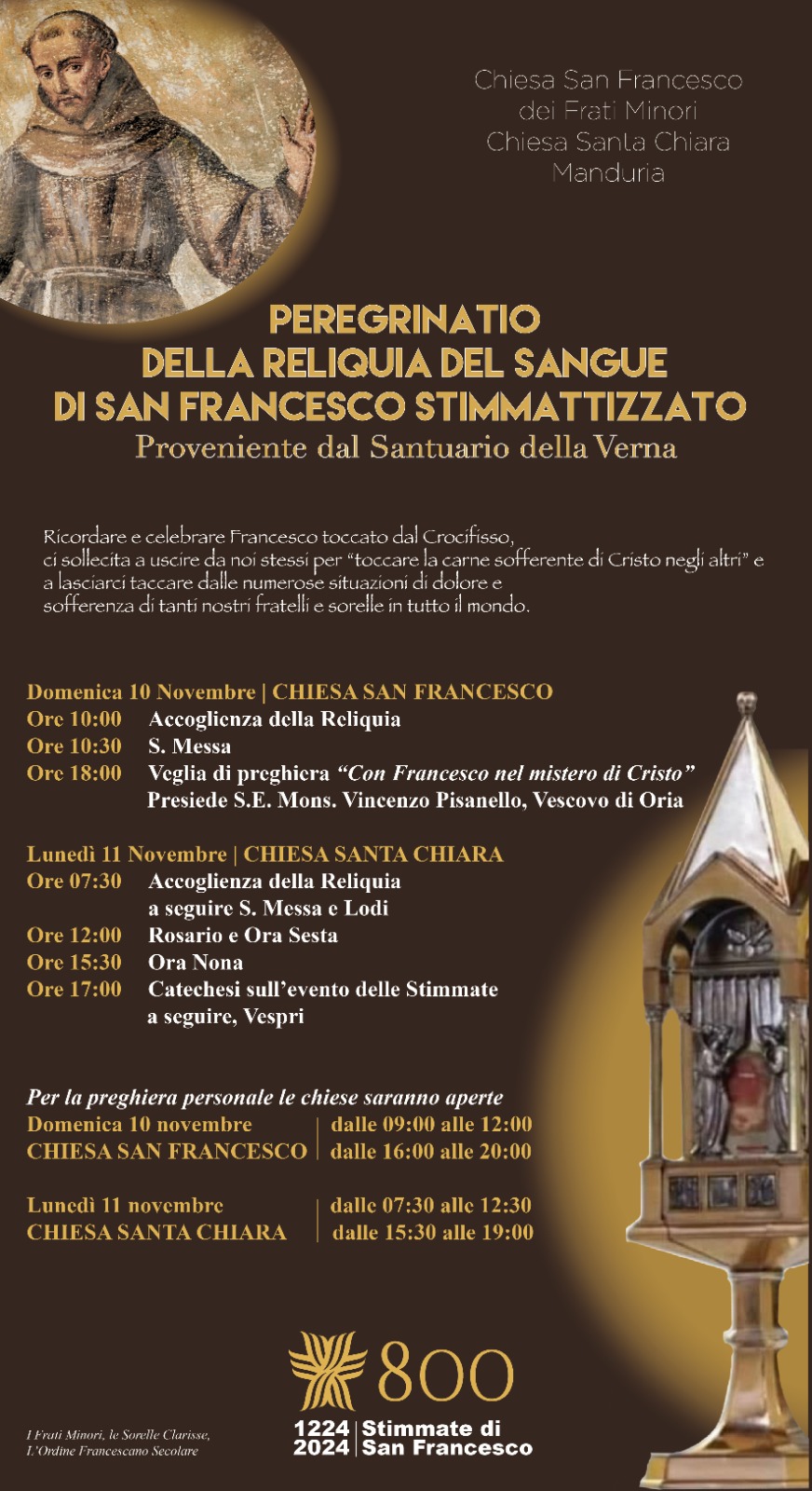 Nel ricordo di quanto è avvenuto sul monte de La Verna (Arezzo) nel settembre del 1224, una preziosa Reliquia del sangue del poverello di Assisi ha visitato tutti conventi dei Frati Minori in Italia.