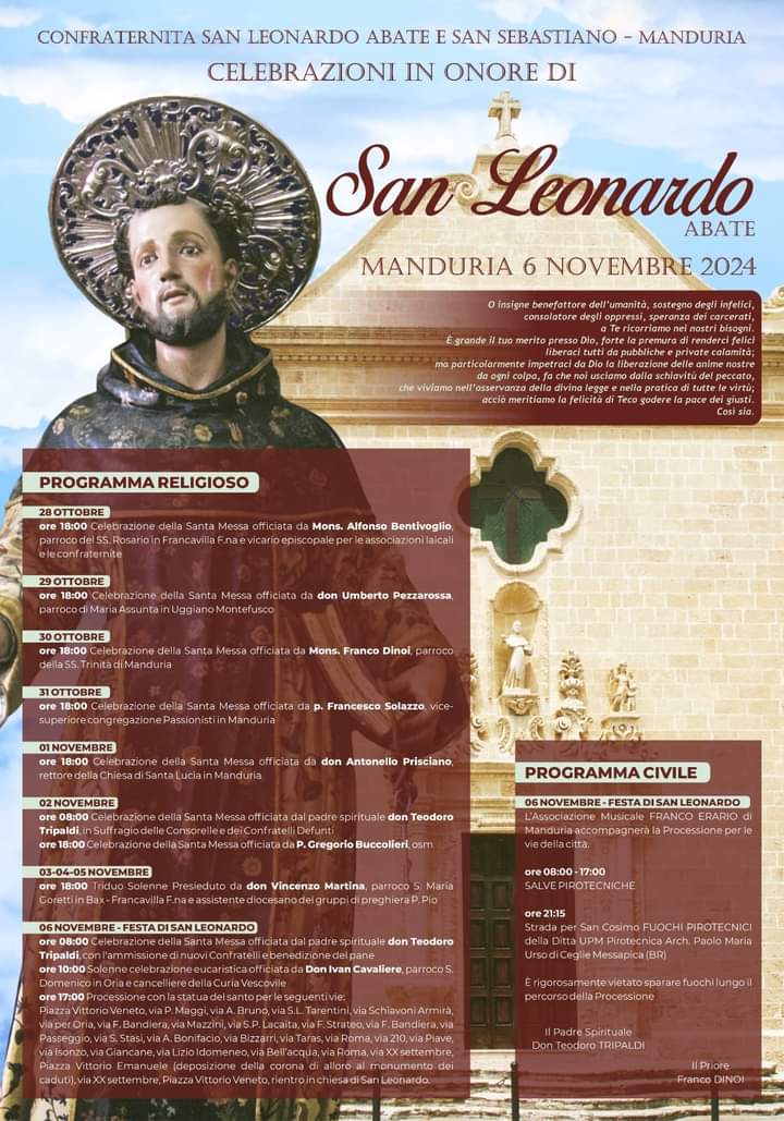Ore 17 processione con la statua del santo per le seguenti vie: piazza Vittorio Veneto, via P. Maggi, via A. Bruno, via S. L. Tarentini, via Schiavoni Armirà. via per Oria, via F. Bandiera, via Mazzini, via S. P. Lacaita, via F. Strateo, via F. Bandiera, via Passeggio, via S. Stasi, via A. Bonifacio, via Bizzarri, via Taras, via Roma, via 210, via Piave, via Isonzo, via Giancane, via Lizio Idomeneo, via Bell’Acqua, via Roma, via XX Settembre, piazza Vittorio Emanuele (deposizione della corona di alloro al monumento ai Caduti), via XX Settembre, piazza Vittorio Veneto, rientro nella chiesa di San Leonardo.