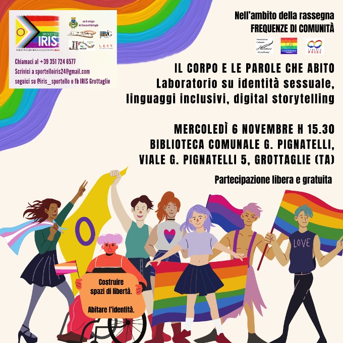 Mercoledì 6 novembre, presso la biblioteca comunale Pignatelli, in via Pignatelli a Grottaglie, a partire dalle ore 15.30, si svolgono alcune attività formative, nell’ambito di un incontro di 3 ore complessive sui linguaggi inclusivi e sulla salute mentale.