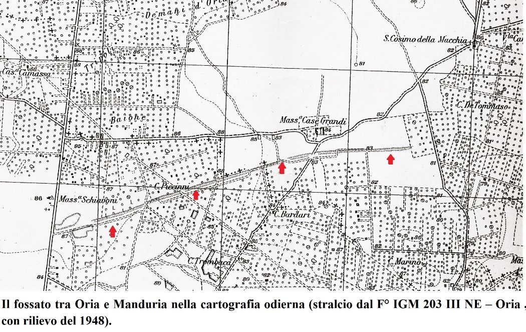 Sempre in riferimento all’Ottocento, il nostro fossato compare in piante dell’epoca, ben tracciato tra le due città messapiche. In età successiva è descritto dal sac. L. TARENTINI nei suoi Cenni storici di Manduria antica - Casalnuovo - Manduria restituita, Taranto, tipografia Tanfani-Latronico, ed 1901 p. 29. Questi annota che tale vallone proseguiva ad ovest, oltre la masseria Schiavoni, area successivamente devastata da attività di cava; precisa inoltre che “il fosso aveva il suo alto muro di difesa formato da poligoni irregolari a base calcarea come lo dimostrano ancora i grossi macigni sparsi in parecchi punti lungo il fosso medesimo” ipotizzando una sua funzione strategica in ambito messapico. Autori successivi collocano un utilizzo o riutilizzo di tale fossato in epoca alto medievale, durante la contesa dei nostri territori tra Bizantini e Longobardi.