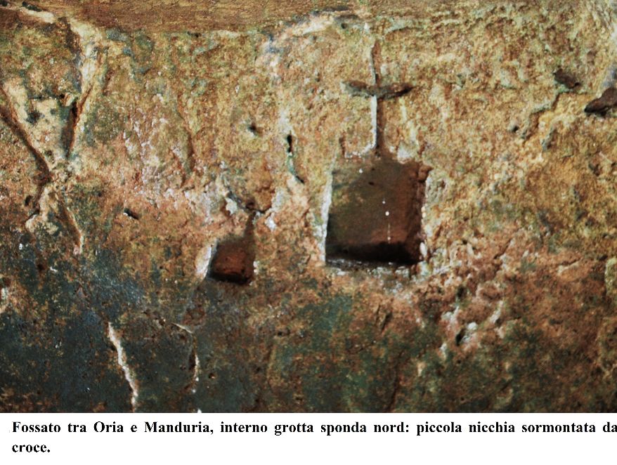 Sempre lungo questo tratto mediano (invero ben conservato nei suoi sei metri di larghezza, per un’altezza attuale di un metro, circa) si osservano due grotte scavate nella roccia, distanti tra loro circa 60 metri, poste rispettivamente sulla sponda sud e nord del vallone; grotte che, per fori e nicchie scavate sulle pareti interne ed esterne, fori di areazione aperti nel soffitto e per simboli interni (croce profondamente incisa su nicchia interna della grotta settentrionale e tre croci incise sulla parete interna della grotta meridionale) richiamano abituri presenti nei nostri contesti rupestri medievali. Si aggiungono quattro tagli nella roccia, visibili, in sezione, sulla sponda settentrionale, occlusi da pietre e terra di un sovrastante muretto a secco, che sembrano riferirsi a tombe medievali (dalle tipiche fiancate rastremate verso l’alto) tagliate dal fossato. Solo scavi regolari ed analisi approfondite potranno confermare o meno tali ipotesi, offrendo la possibilità di elementi più precisi per la datazione del vallone.