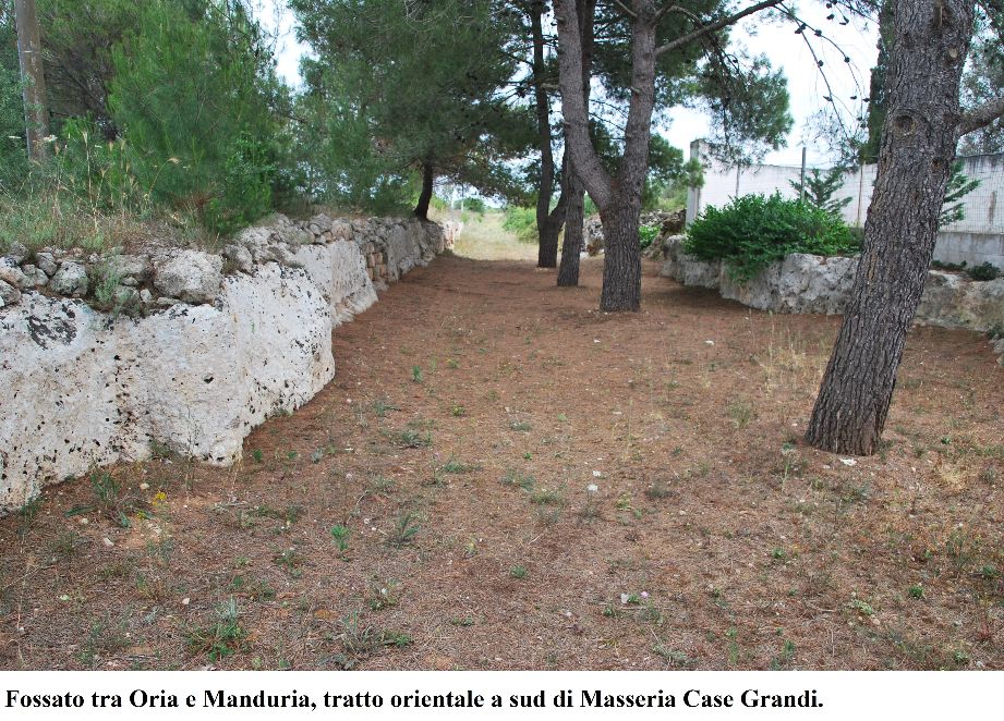 Proseguendo verso est, il nostro fossato rivela un altro tratto agevolmente percorribile, posto a sud di masseria Case Grandi. Qui il vallone incrocia la via vecchia o, meglio, il largo stradone campestre proveniente da Manduria e diretto, attraverso aree rurali diffusamente intaccate da cave, verso il Santuario di S. Cosimo alla Macchia; stradone che, superato il fossato (e congiuntosi con un’arteria campestre proveniente dalla provinciale Manduria-Oria - versante specchia Schiavoni) punta decisamente ad est, venendo affiancato (a trecento metri circa dall’innesto con l’attuale provinciale Manduria-S. Cosimo), da profondi solchi carrai, anch’essi orientati verso il Santuario.