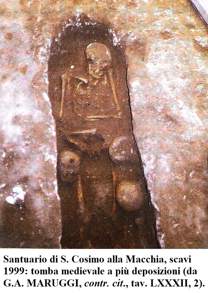 Resti medievali sono ulteriormente attestati da recenti indagini archeologiche (anno 1999) effettuate all’interno del Santuario, con messa in luce di varie cisterne per la conservazione di derrate o per liquidi, cui si aggiungono trentadue tombe a fossa, alcune di infanti o adolescenti, inquadrabili intorno al XIII-XIV sec. d.C. (vedi G.A. MARUGGI, Oria (Brindisi), Santuario di San Cosimo, in “Taras”, XX (2000), 1-2, pp. 132-134). Alcune di queste tombe sono attualmente in vista, ricoperte da una pavimentazione a vetri, nel vano antistante della vecchia sacrestia, oggi adibito ad esposizione di pregevoli presepi. Ed in questa sacrestia si ipotizza l’antica chiesetta medievale segnalata dalle fonti, a ridosso della quale fu costruito, nei primi decenni del XVIII secolo, il nuovo edificio sacro, ingrandito, poi, in anni successivi (vedi F. CONTI, I Santi Medici nella storia e nel culto, Oria 1954 (ristampa 1999).