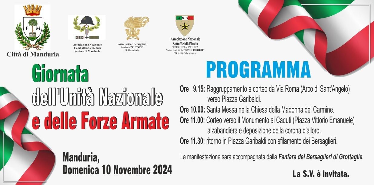 Sarà celebrata domenica prossima (10 novembre) la Giornata dell’Unità Nazionale e della Forze Armate. Questo il programma dell’iniziativa, promossa dal Comune di Manduria, dalla sezione di Manduria dell’Associazione Combattenti e Reduci, dall’Associazione Bersaglieri sezione “E. Toti” di Manduria e dalla sezione di Manduria dell’Associazione Nazionale Sottufficiali d’Italia, intitolata ad Antonio Dimitri.