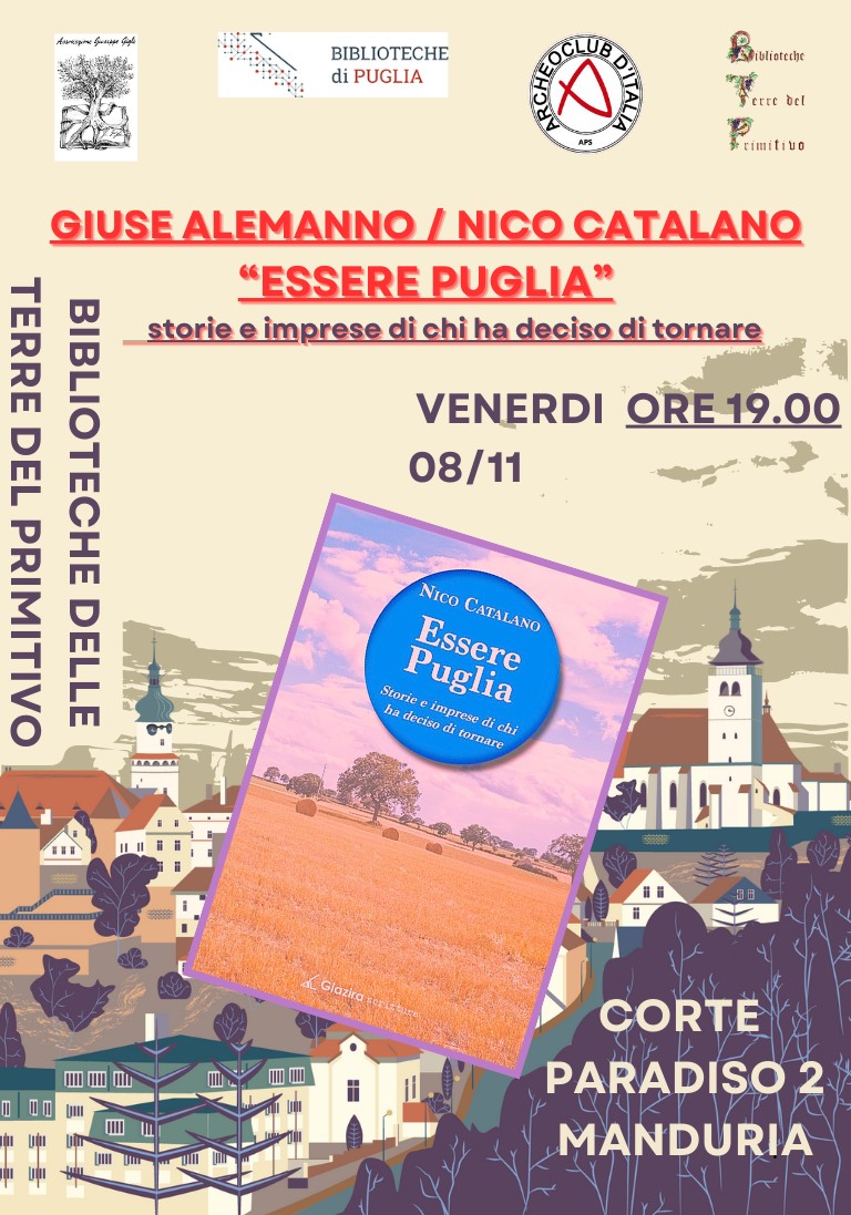 Venerdì 8 novembre Nico Catalano e Giuse Alemanno dialogheranno di “Essere Puglia - storie e imprese di chi ha deciso di tornare”, pamphlet che valorizza il recupero della nostra terra erosa dallo spopolamento, e che mette in luce le coraggiose esperienze di “restanza”.