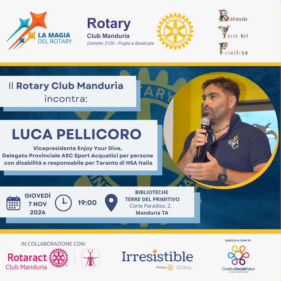 Giovedì 7 novembre, alle 19, per la rassegna “Il Rotary Club Manduria incontra...” , Luca Pellicoro - vice presidente di Enjoy your dive - racconterà la propria esperienza di convivenza e superamento dei limiti fisici, portando il suo esempio di perseveranza e speranza.