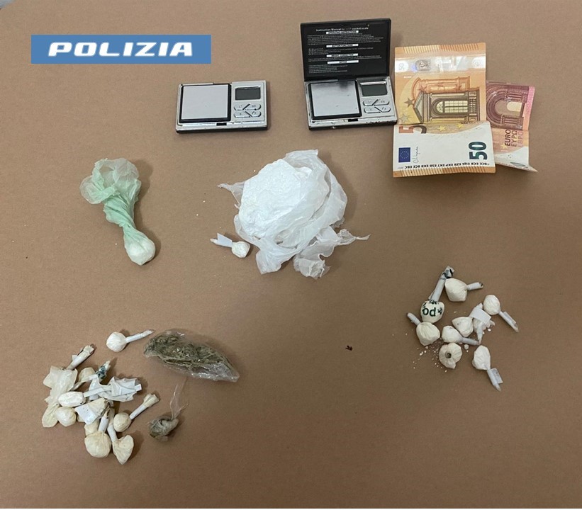 Nel corso della minuziosa perquisizione degli ambienti, i poliziotti sono riusciti a recuperare nel cortile retrostante, nascosti nella fossa di raccolta dei liquami, una decina di piccoli involucri in cellophane trasparente con all’interno cocaina per un peso complessivo di circa otto grammi  ed un altro piccolo involucro di marjuana del peso di tre grammi, oltre a due bilancini elettronici di precisione di colore nero privi di marca, perfettamente funzionanti