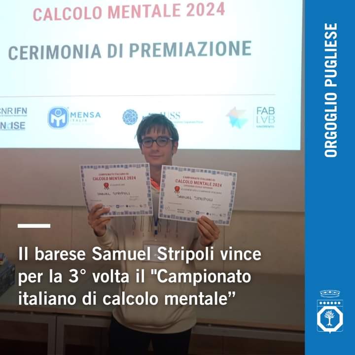 Lo studente quindicenne del liceo scientifico “Scacchi” di Bari ha trionfato nuovamente nell'ambito delle discipline matematiche vincendo, a Genova, il Campionato italiano di “Calcolo mentale 2024”.