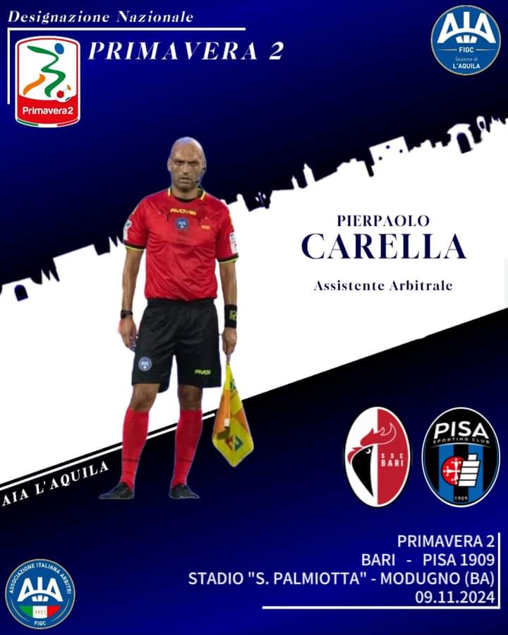 Pierpaolo Carella (AIA L’Aquila) èstato designato come assistente per l’incontro di calcio del campionato Primavera 2 fra Bari e Pisa, in programma sabato pomeriggio (calcio d’inizio alle 14,30) a Modugno.