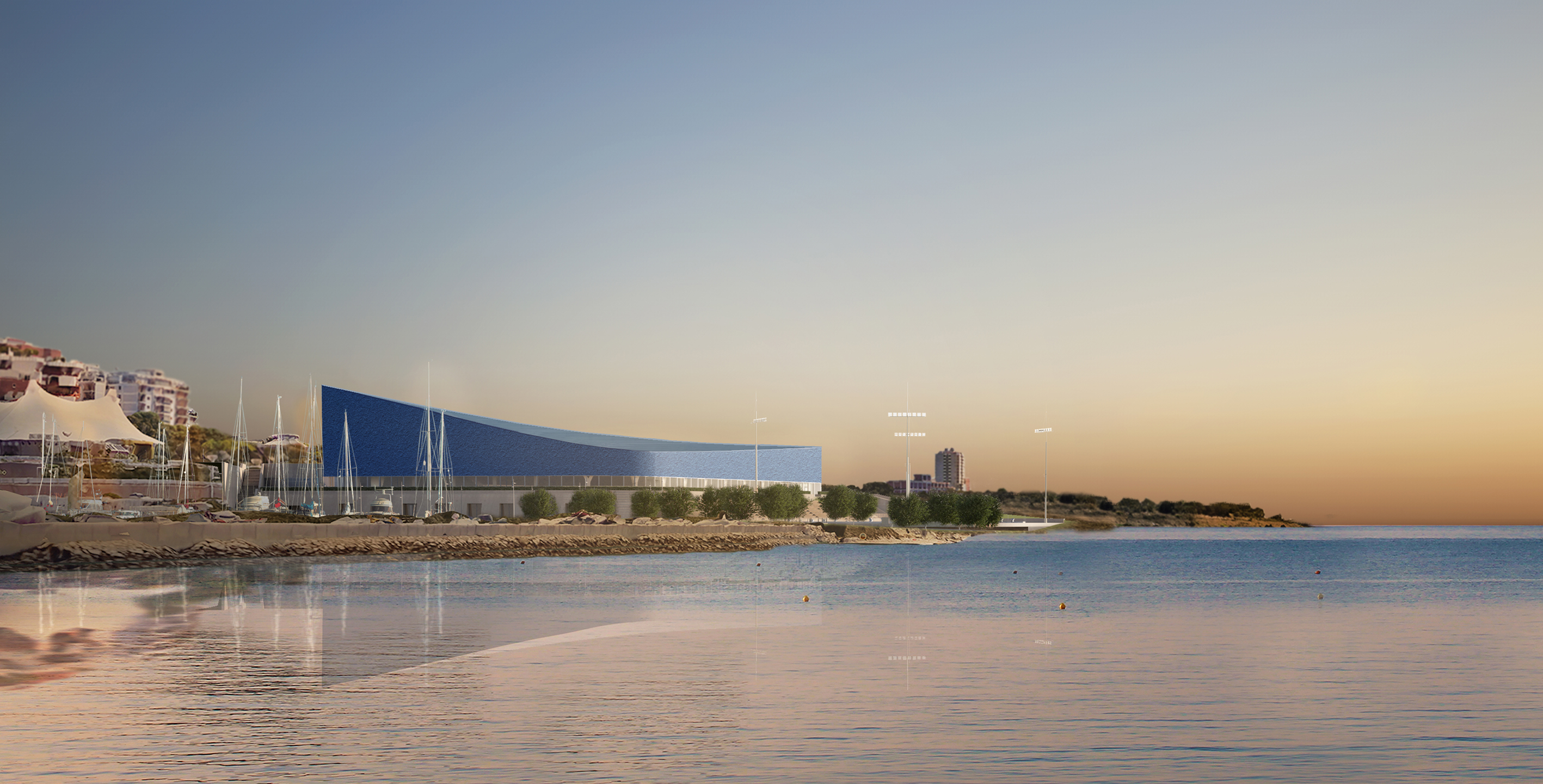 , si ispira ai bastioni di Taranto, creando un landmark che si integra armoniosamente con la costa grazie a forme, colori e materiali e all’integrazione di aree verdi e ricreative. Lo Stadio del Nuoto è disposto su tre livelli che degradano verso il mare, seguendo l'andamento naturale del terreno e prevedendo un accesso diretto alla costa attraverso le aree verdi antistanti della Marina Militare. In corrispondenza di viale Virgilio si creerà una piazza urbana in connessione con la torre d’Ayala, integrando le aree di parcheggio e il viale pedonale/ciclabile che porta allo stadio. Questo sistema di percorsi faciliterà il collegamento tra la struttura natatoria, la Città e i parcheggi, mantenendo un uso sostenibile del suolo per valorizzare il parco e le aree archeologiche, creando uno spazio di svago e di aggregazione sociale.