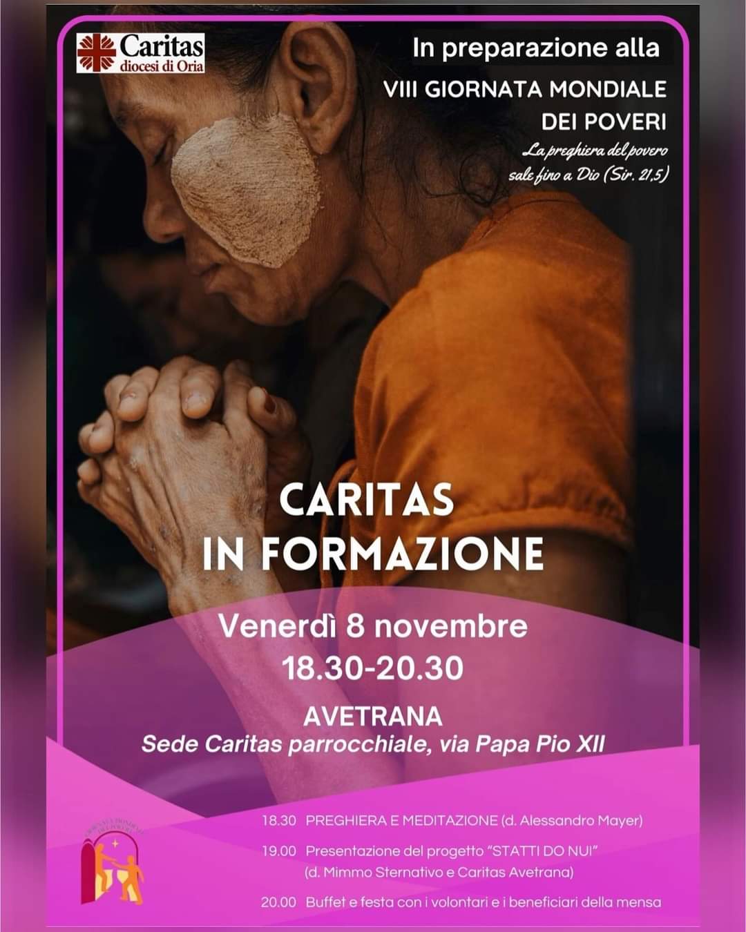 Questa sera (venerdì 8 novembre) gli operatori e i volontari della Caritas parrocchiali della nostra Diocesi di Oria vivranno l’appuntamento formativo in preparazione alla VIII Giornata mondiale dei Poveri.