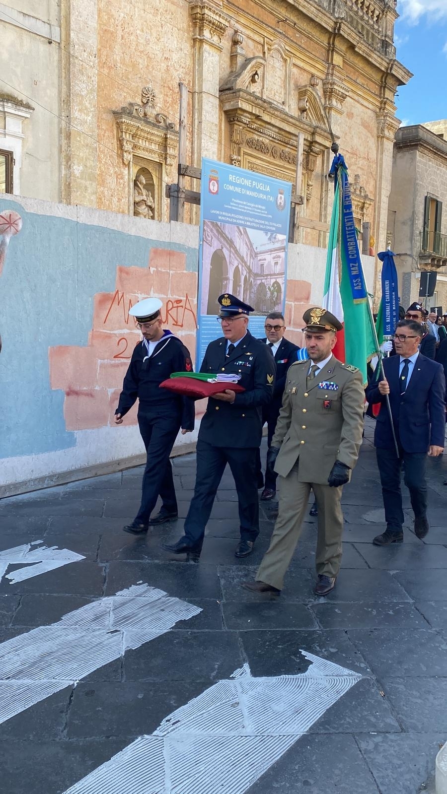 Nella mattinata di ieri (domenica 10 novembre), si sono svolte a Manduria le celebrazioni della “Giornata dell'Unità Nazionale e delle Forze Armate”. L’evento è stato aperto, alle ore 9:30, con il corteo dall’arco di Sant’Angelo sino alla chiesa della Madonna del Carmine, con la presenza di autorità civili, militari e politiche insieme ai rappresentanti dell’Associazione Nazionale Combattenti e Reduci, dell’Associazione Nazionale Sottufficiali d’Italia, dell’Associazione Carabinieri, dell’Associazione Nazionale Bersaglieri, dell’Associazione Nazionale Partigiani d’Italia, dell’Associazione Nazionale Mauriziani e della fanfara di Grottaglie.