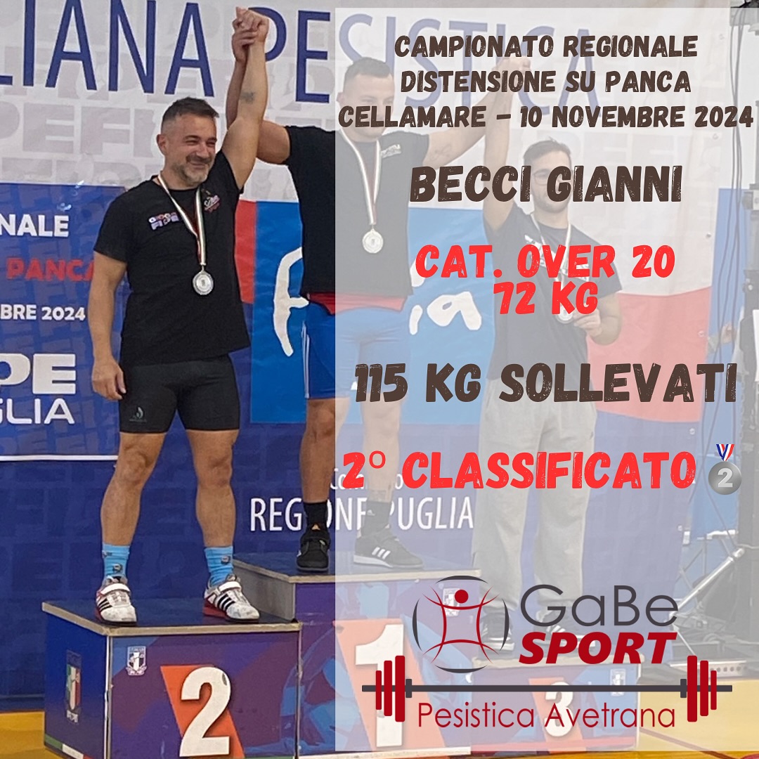 Medaglia d’argento a Gianni Becci nella categoria over 20 sino a 72 kg: ha sollevato 115 kg