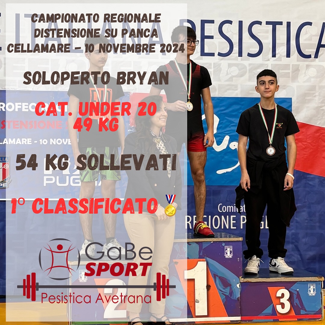 Medaglia d’oro a Bryan Soloperto nella categoria under 20 sino a 49 kg: ha sollevato 54 kg