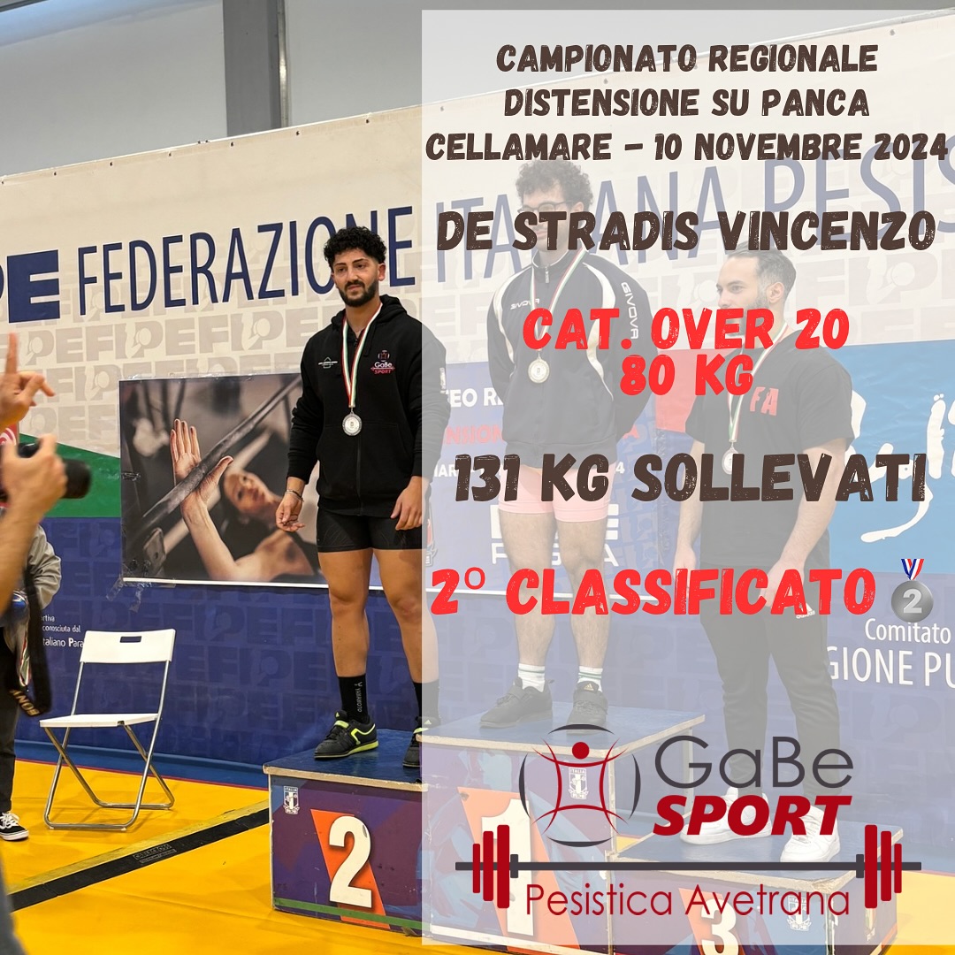 Medaglia d’argento a Vincenzo De Stradis nella categoria over 20 sino a 80 kg: ha sollevato 131 kg