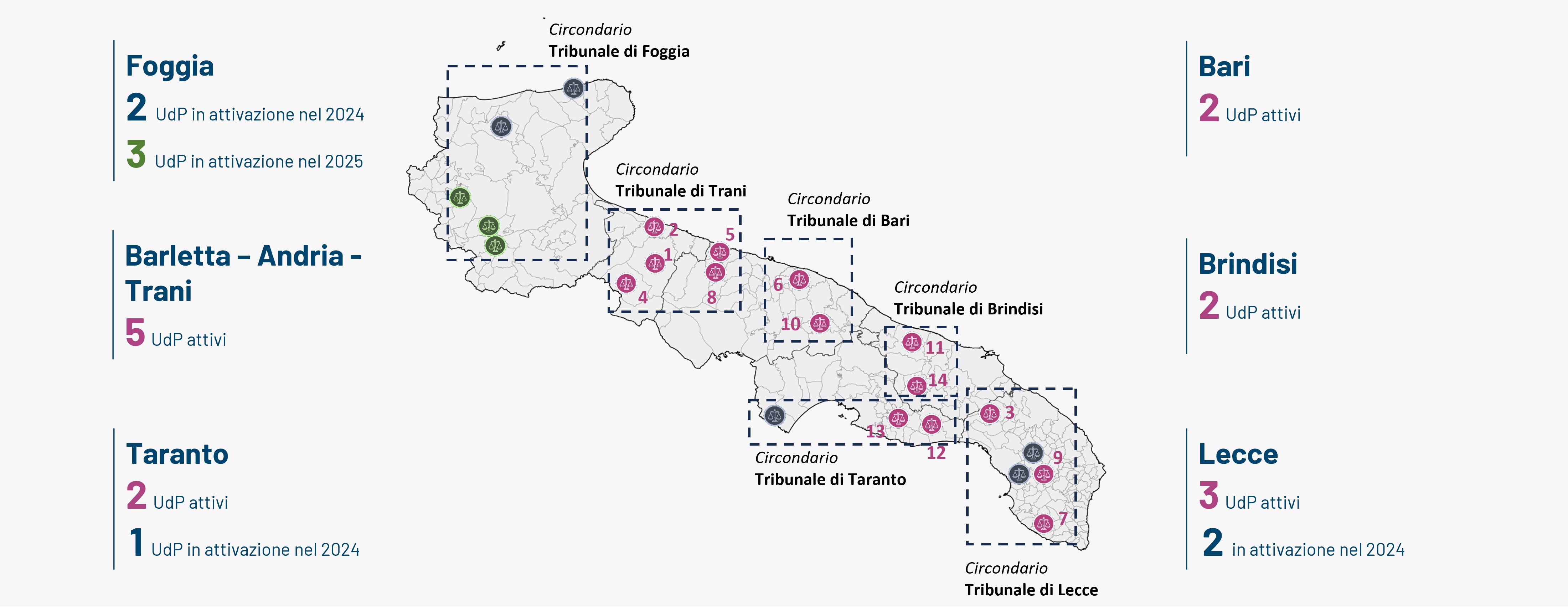 Con questa apertura, salgono a 14 gli Uffici di Prossimità operativi nella Regione Puglia, distribuiti nei seguenti Comuni/ Unioni di Comuni: