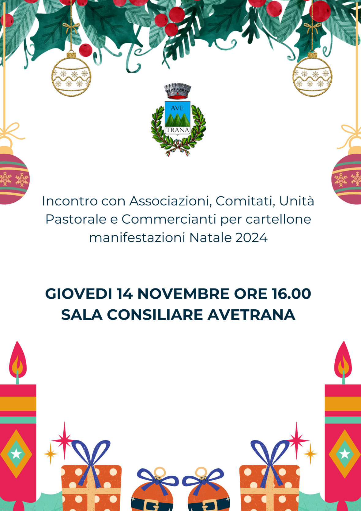 Si terrà oggi pomeriggio, alle ore 16, presso la sala consiliare del Comune di Avetrana un incontro con Unità Pastorale, associazioni, commercianti, comitati e chiunque voglia organizzare eventi durante il periodo natalizio.