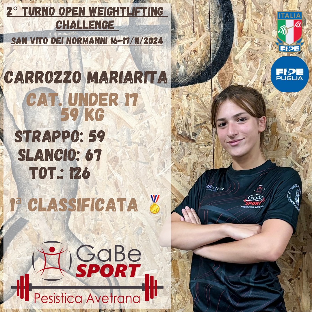 Maria Rita Carrozzo, categoria under 17, 59 kg: strappo 59, slancio 67, totale 126 kg