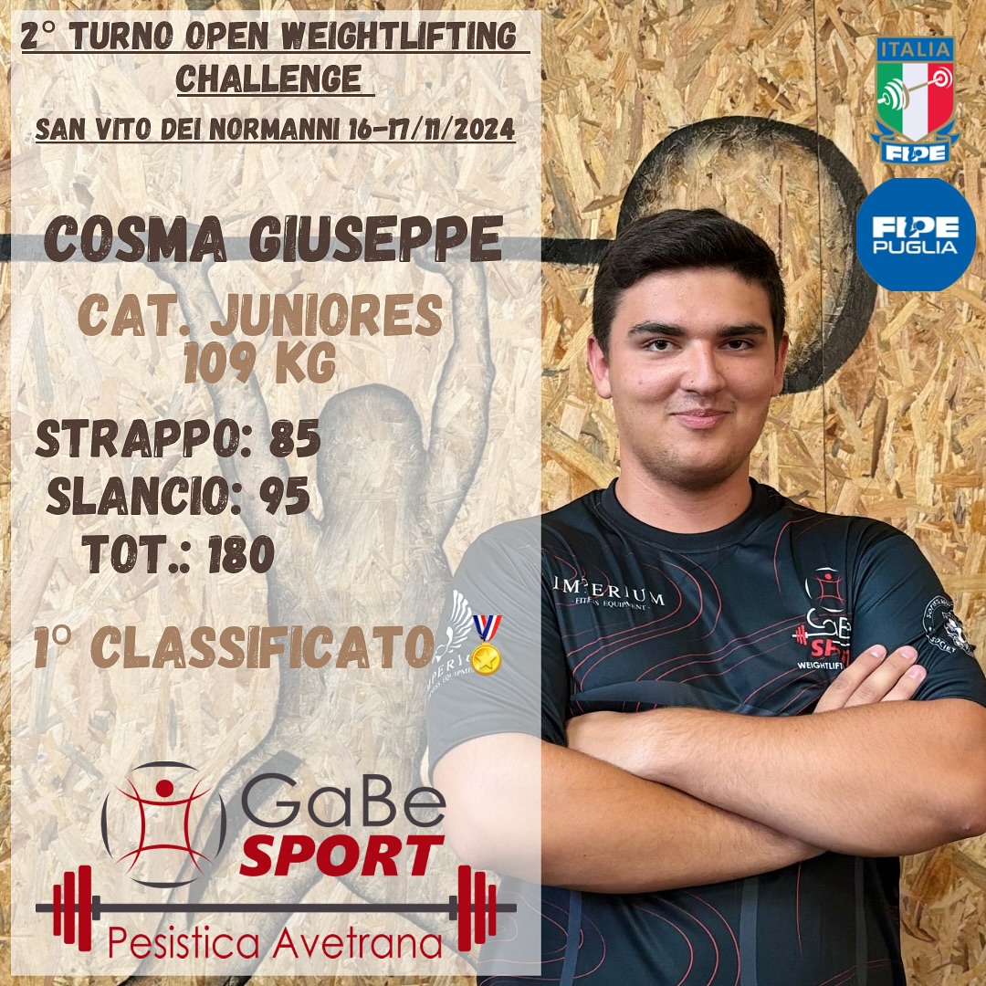 Giuseppe Cosma, categoria juniores, 109 kg: strappo 85, slancio 95, totale 180 kg