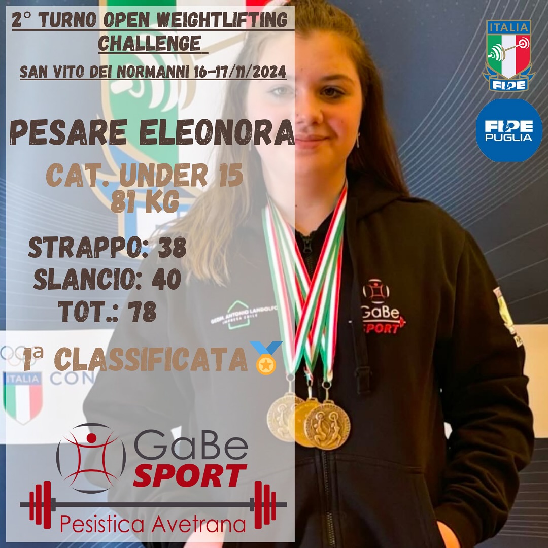 Eleonora Pesare, categoria under 15, 81 kg: strappo 38, slancio 40, totale 78 kg
