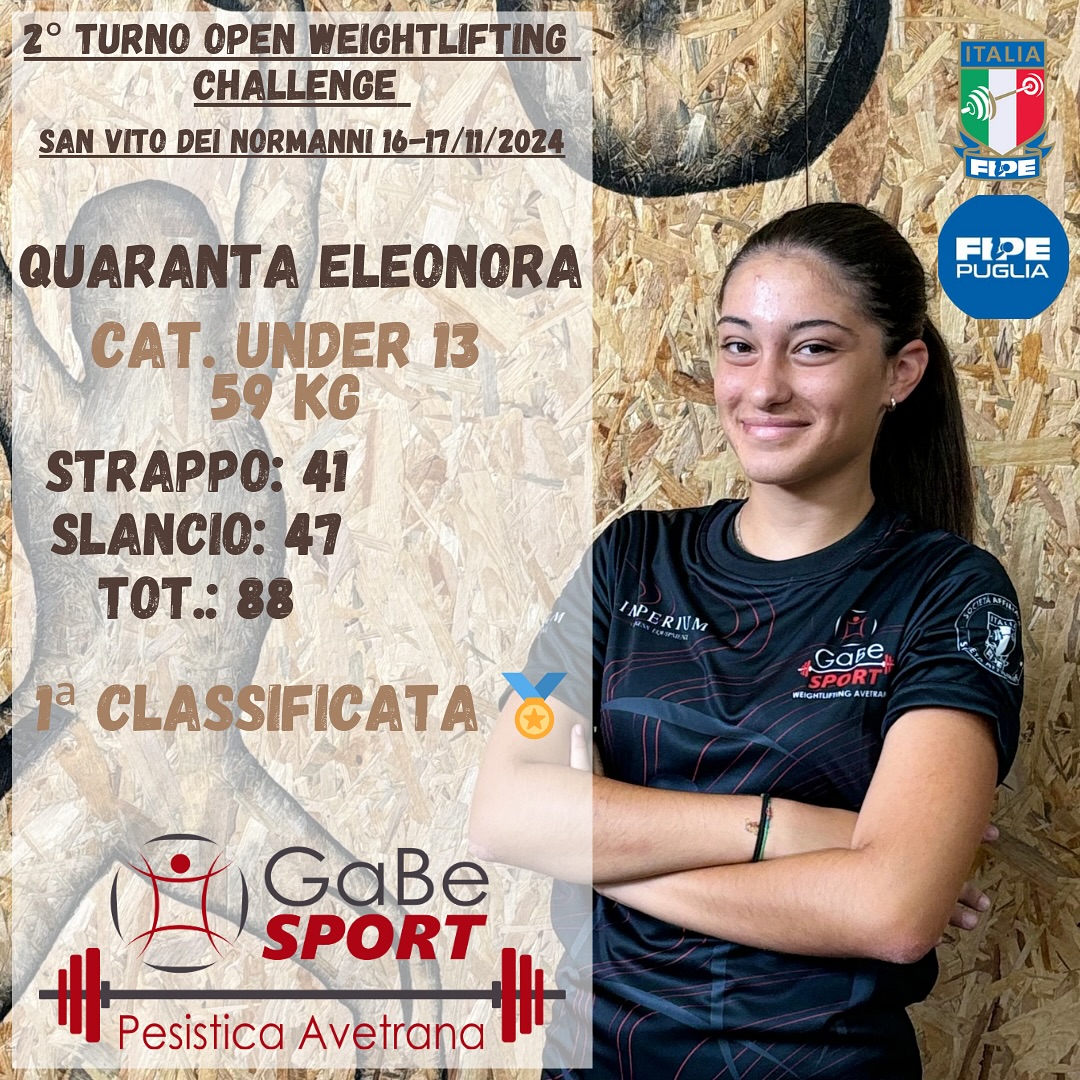 Eleonora Quaranta, categoria under 13, 59 kg: strappo 41, slancio 47, totale 88 kg