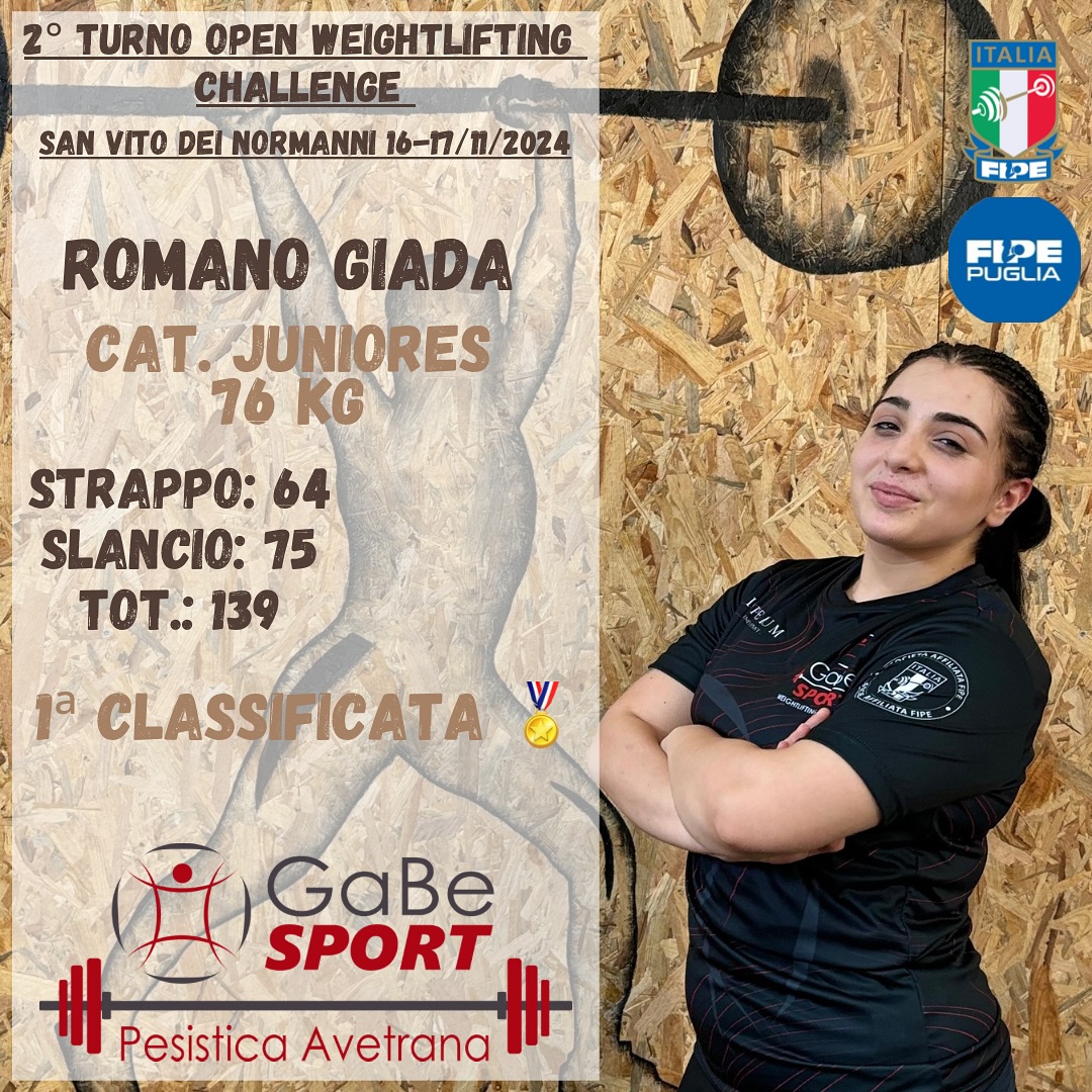 Giada Romano, categoria juniores, 76 kg: strappo 64, slancio 75, totale 139 kg