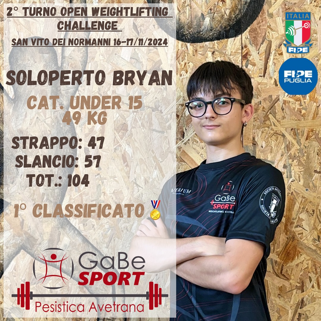 Bryan Soloperto, categoria under 15, 49 kg: strappo 47, slancio 57, totale 104 kg