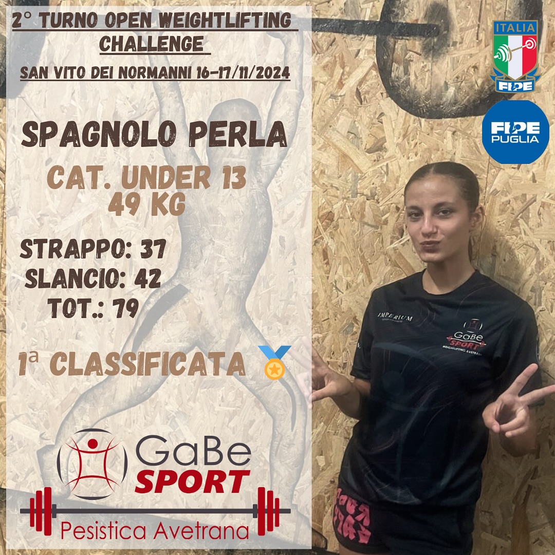 Perla Spagnolo, categoria under 13, 49 kg: strappo 37, slancio 42, totale 79 kg
