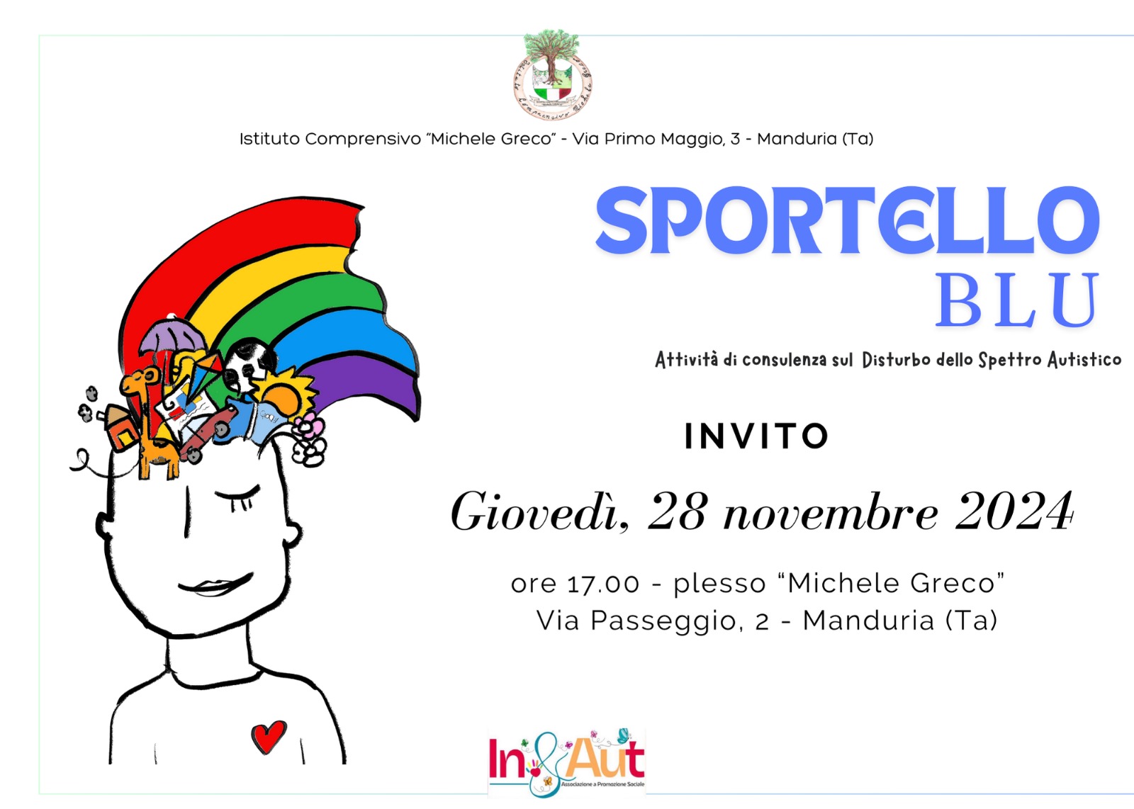 Lo sportello blu avrà una sede fisica presso l’istituto comprensivo Michele Greco di Manduria ogni giovedì dalle 17 alle 19, grazie alla sensibilità del dirigente Pietro Pulieri.