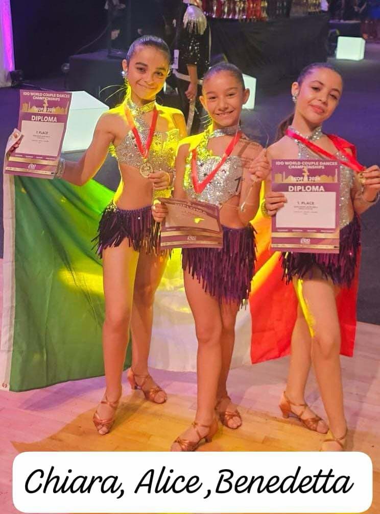Il titolo di campionesse mondiali Ido 2024 per ben 2 volte lo conquistano a soli 9/10 anni Chiara Epifani, Benedetta Epifani e Alice Dell’Atti nel Gruppo Latin e nel Synchro Dance Children salendo sul gradino più alto del podio davanti ad un gruppo della Romania e uno della Bulgaria.