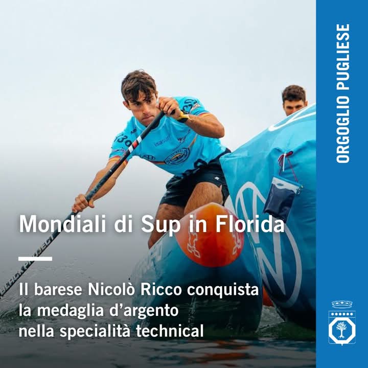 Un atleta pugliese conquista la medaglia d’argento ai Mondiali di sup (stand-up paddle, ovvero fare surf remando con la pagaia in piedi sulla tavola) in Florida. Si tratta del 18enne barese Nicolò Ricco, che si è classificato al secondo posto ai Mondiali a Sarasota (FL) nella specialità technical junior.