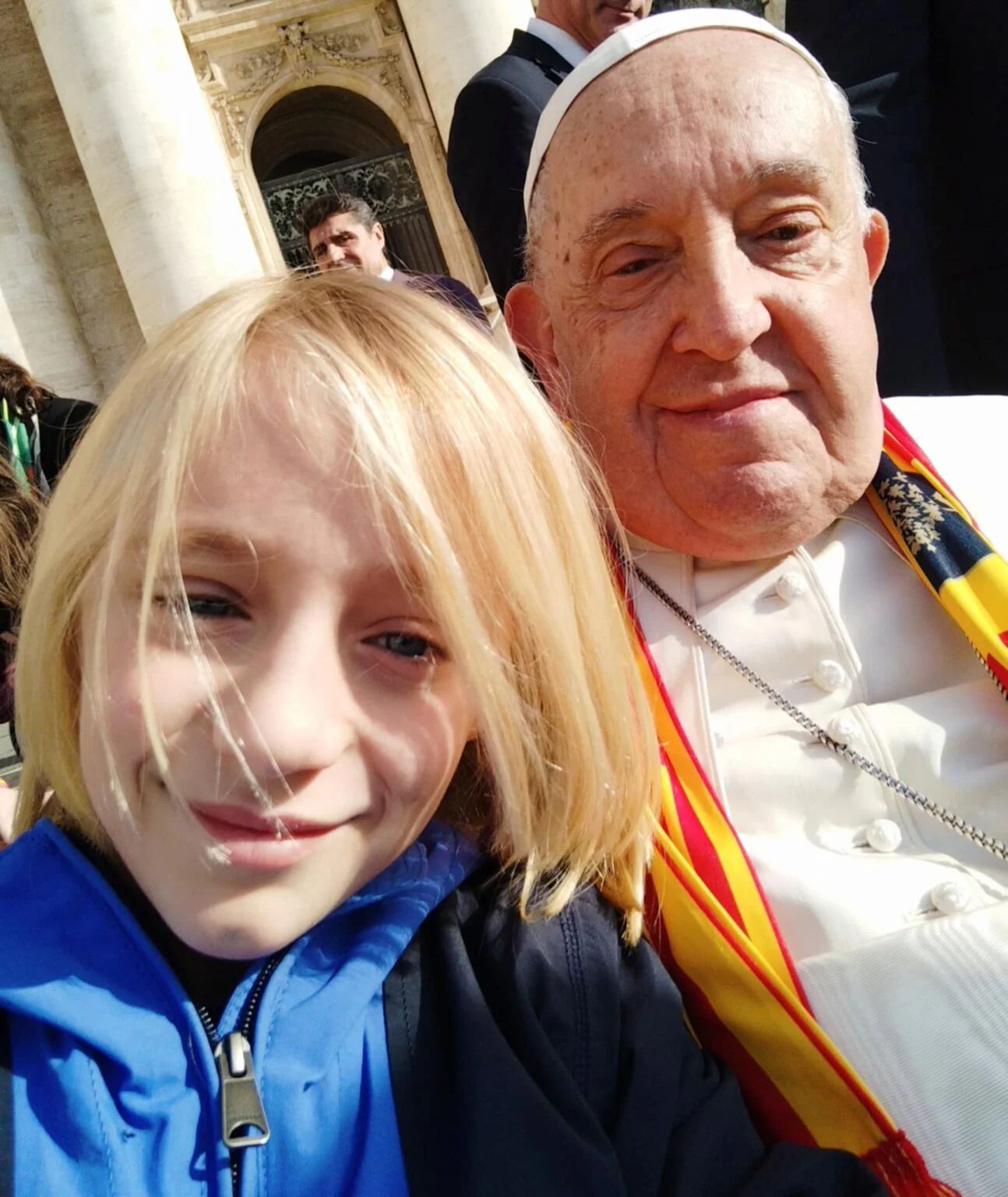 Filippo, 9 anni, ha regalato a Papa Francesco la sciarpa giallorossa del Lecce e poi si è fatto un selfie.