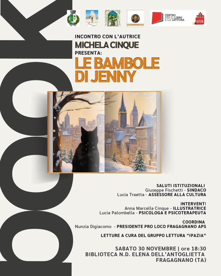 Si terrà domani, 30 novembre, alle ore 18.30, presso la biblioteca “Elena Dell’Antoglietta” di Fragagnano, l'’incontro con l’autrice Michela Cinque per la presentazione del suo ultimo libro, “Le bambole di Jenny”.