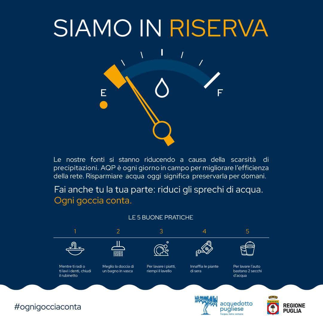 Le scarse piogge sulle fonti riducono sempre più la disponibilità idrica: i prelievi restano superiori agli afflussi ed è necessario contenere i consumi. In assenza di adeguate precipitazioni, già da gennaio infatti la quantità di acqua disponibile potrebbe essere insufficiente a soddisfare appieno la domanda. Ogni goccia è fondamentale per superare la crisi idrica. Da quelle risparmiate da Acquedotto Pugliese (AQP) con la tecnologia messa in campo negli ultimi anni, a quelle che possono recuperare, con piccoli gesti quotidiani4 milioni di cittadini serviti. È necessario inoltre continuare a mantenere ridotta la pressione nel rispetto degli standard di qualità previsti dalla Carta del servizio idrico integrato. Meno acqua sarà consumata da tutti, più si allontanerà il rischio di inasprimento delle restrizioni. Un messaggio al centro della campagna di sensibilizzazione di AQP: Siamo in riserva.