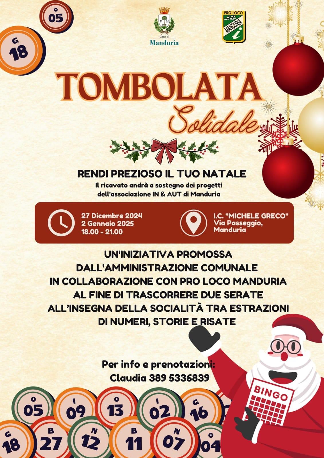 L’Amministrazione comunale, in collaborazione con Pro Loco Manduria, sta organizzando la Tombolata Solidale per trascorrere un pomeriggio spensierato con uno dei giochi più tradizionali delle festività natalizie.