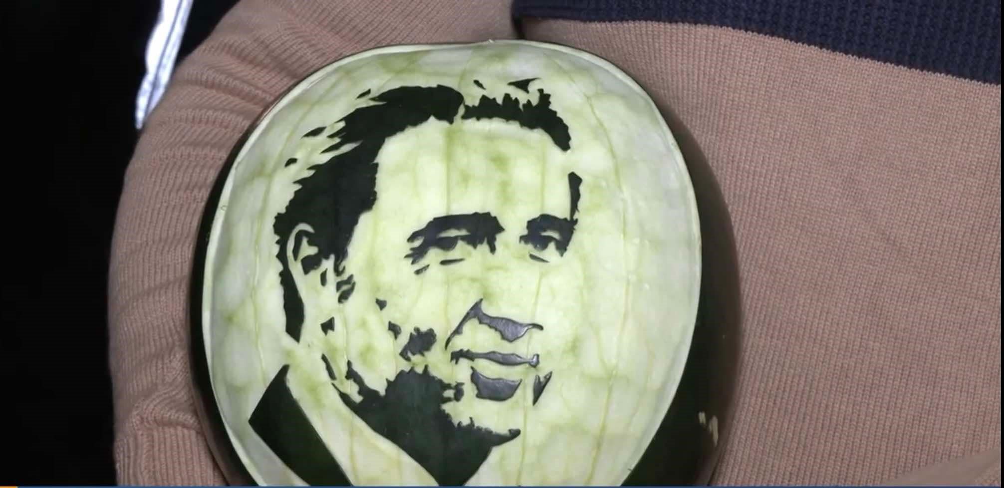 Giuseppe Guida ha consegnato al regista Paolo Sorrentino il suo ritratto realizzato dall’artista maruggese su un’anguria.