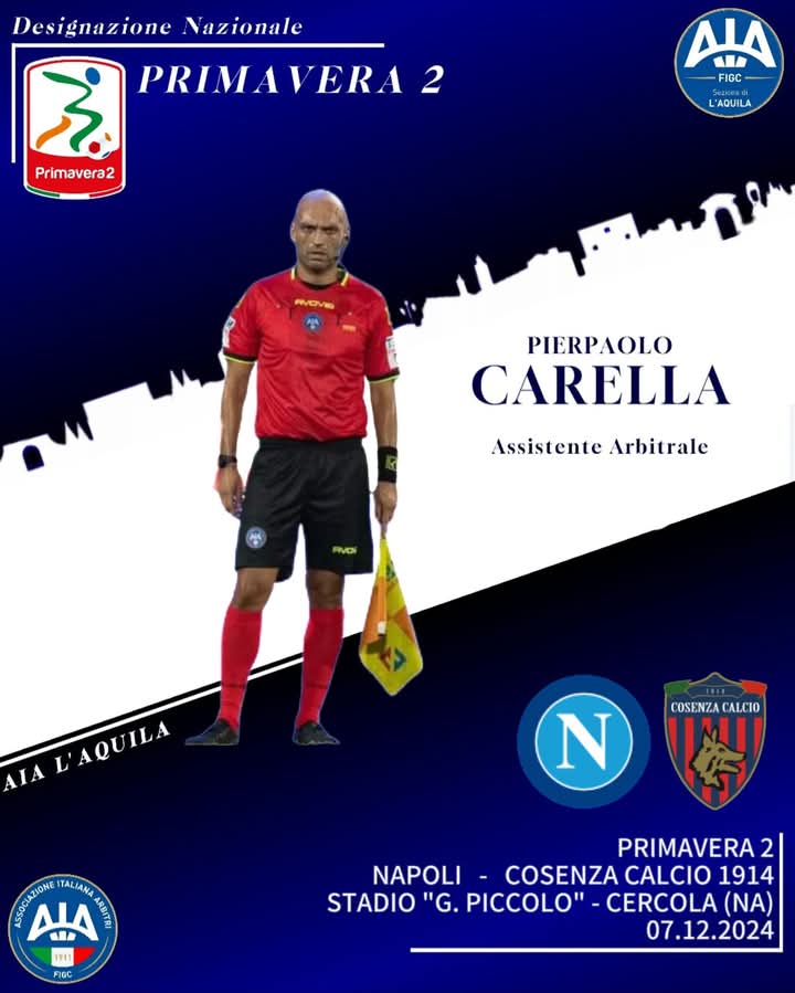 Pierpaolo Carella (tesserato per la sezione AIA de L’Aquila) è stato designato come assistente per la partita fra Napoli e Cosenza del girone B del campionato Primavera 2.