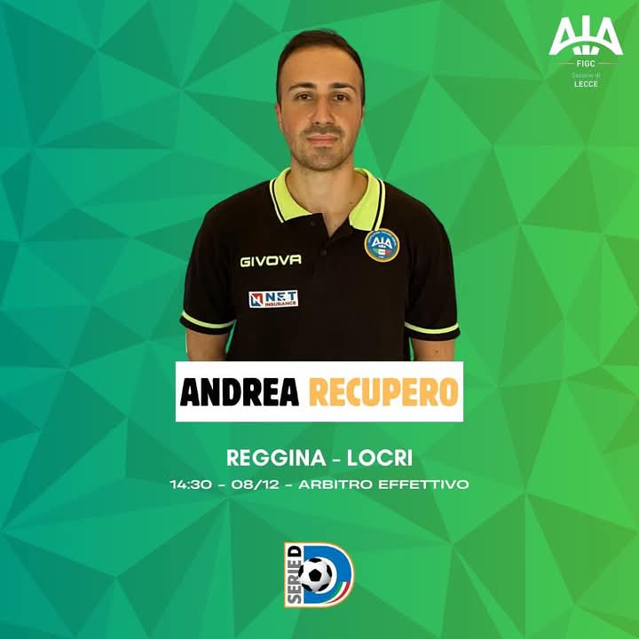 Andrea Recupero, tesserato per la sezione AIA di Lecce, è stato designato per arbitrare l’incontro fra Reggina e Locri, inserito nel programma della 15ª giornata del girone I della serie D. L’incontro si disputerà domenica 8 dicembre al Granillo di Reggio Calabria, con calcio di inizio alle ore 14,30.