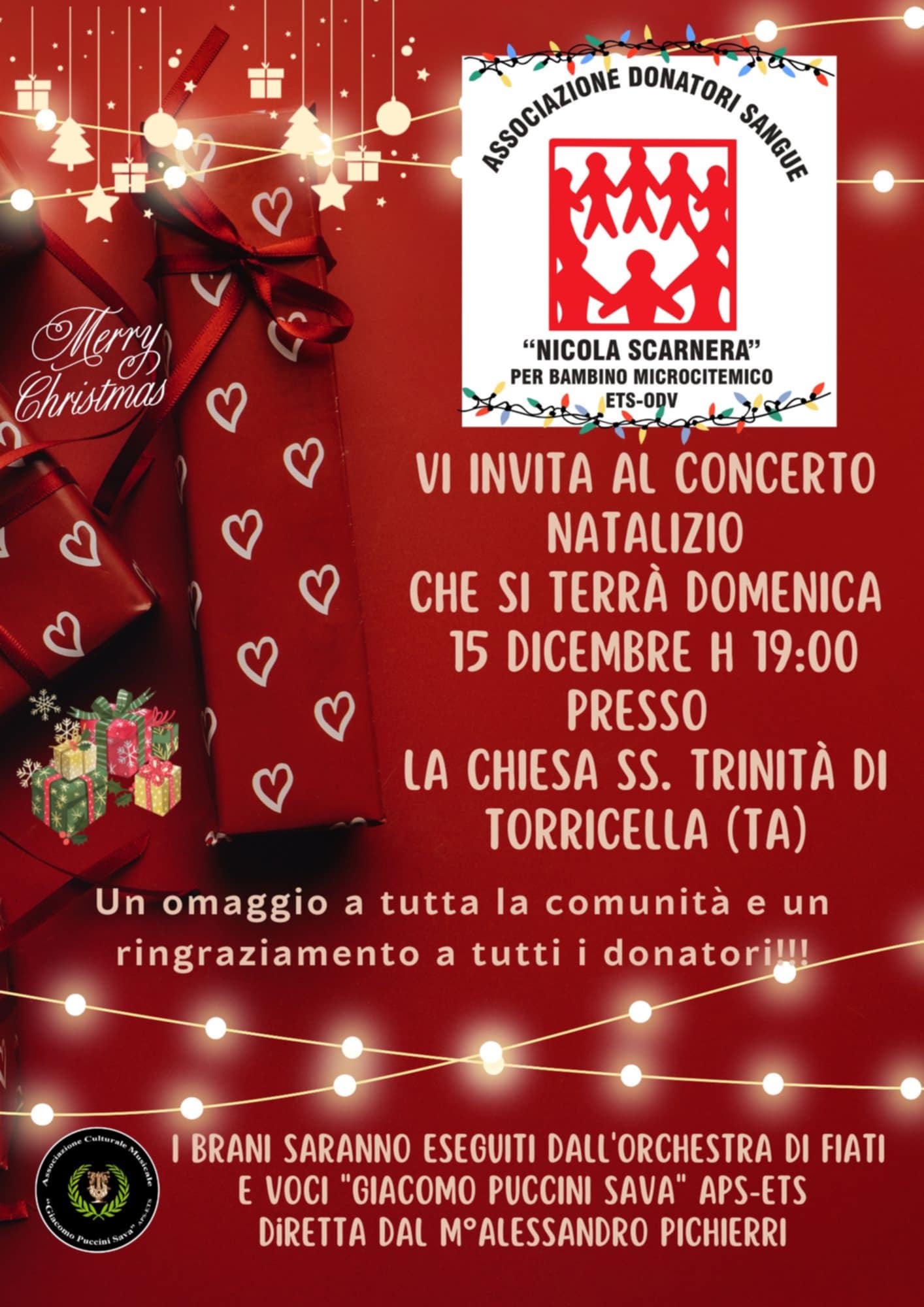 L’associazione Donatori Sangue “Nicola Scarnera” ODV-ETS per Bambino Microcitemico di Taranto omaggia tutta la comunità e i donatori offrendo un concerto natalizio presso la chiesa della SS. Trinità di Torricella domenica 15 dicembre alle ore 19.