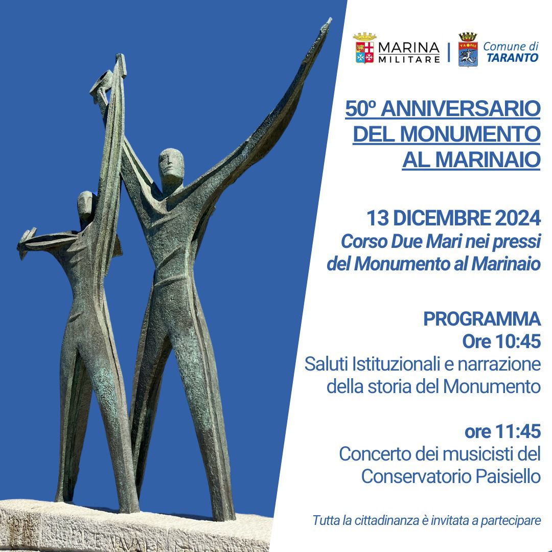 Si tratterà di un evento per il quale l’attesa è densa di significato, come si può evincere dalle parole del sindaco Melucci: “E’ con grande orgoglio che ci prepariamo a celebrare il cinquantesimo anniversario di un Monumento che rappresenta la dedizione ed il sacrificio dei nostri marinai, che è diventato un simbolo iconico di Taranto e del suo legame con la Marina Militare. Dal giorno della sua inaugurazione, le statue che raffigurano due marinai che, uniti da un abbraccio ideale, salutano chi arriva dal mare testimoniano la storia e la cultura marittima della nostra città. Questo evento non celebra solo il passato, ma ci ispira a lavorare insieme per costruire un futuro migliore per Taranto e per i nostri figli.”