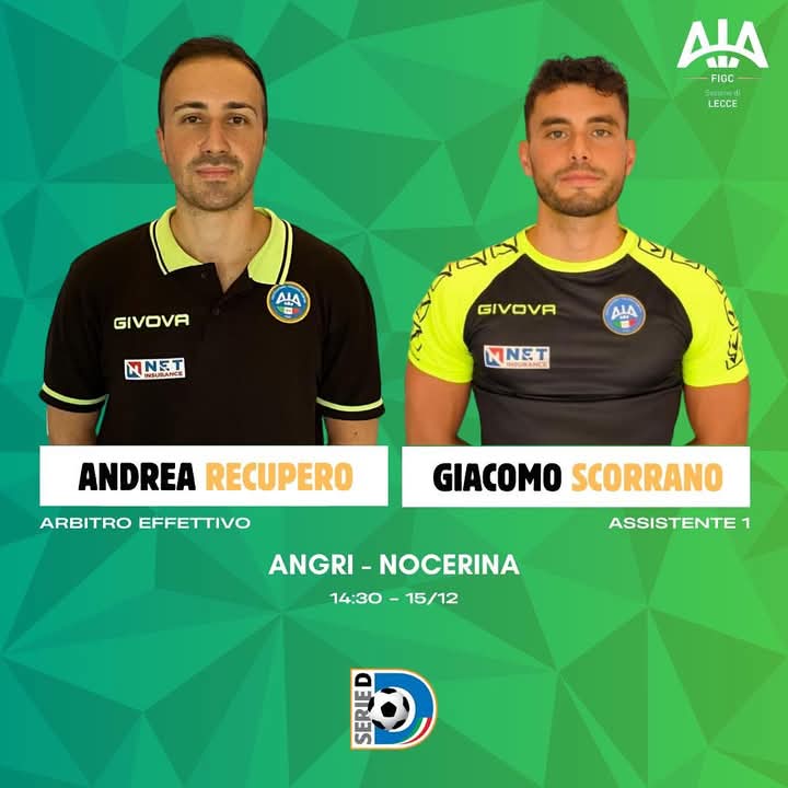 L’arbitro Andrea Recupero, iscritto alla sezione AIA di Lecce, dirigerà domani pomeriggio il derby campano di serie D fra Angri e Nocerina.