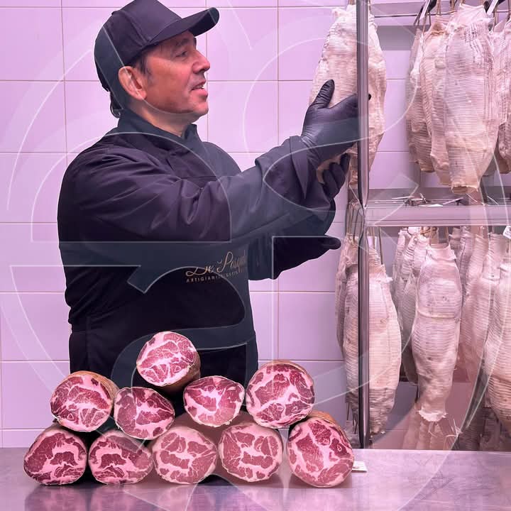 Il capocollo di Manduria è un’eccellenza unica della nostra tradizione, resa ancora più speciale dalla sua marinatura nel vino Primitivo. Questo passaggio dona al prodotto un aroma intenso e un sapore unico, perfettamente equilibrato. Realizzato con la parte più pregiata del collo del maiale, viene salato, speziato, avvolto a mano e stagionato con cura, completando il tutto con una leggera affumicatura. La marezzatura perfetta e il profumo inconfondibile raccontano tutta l’artigianalità e la passione della nostra terra.