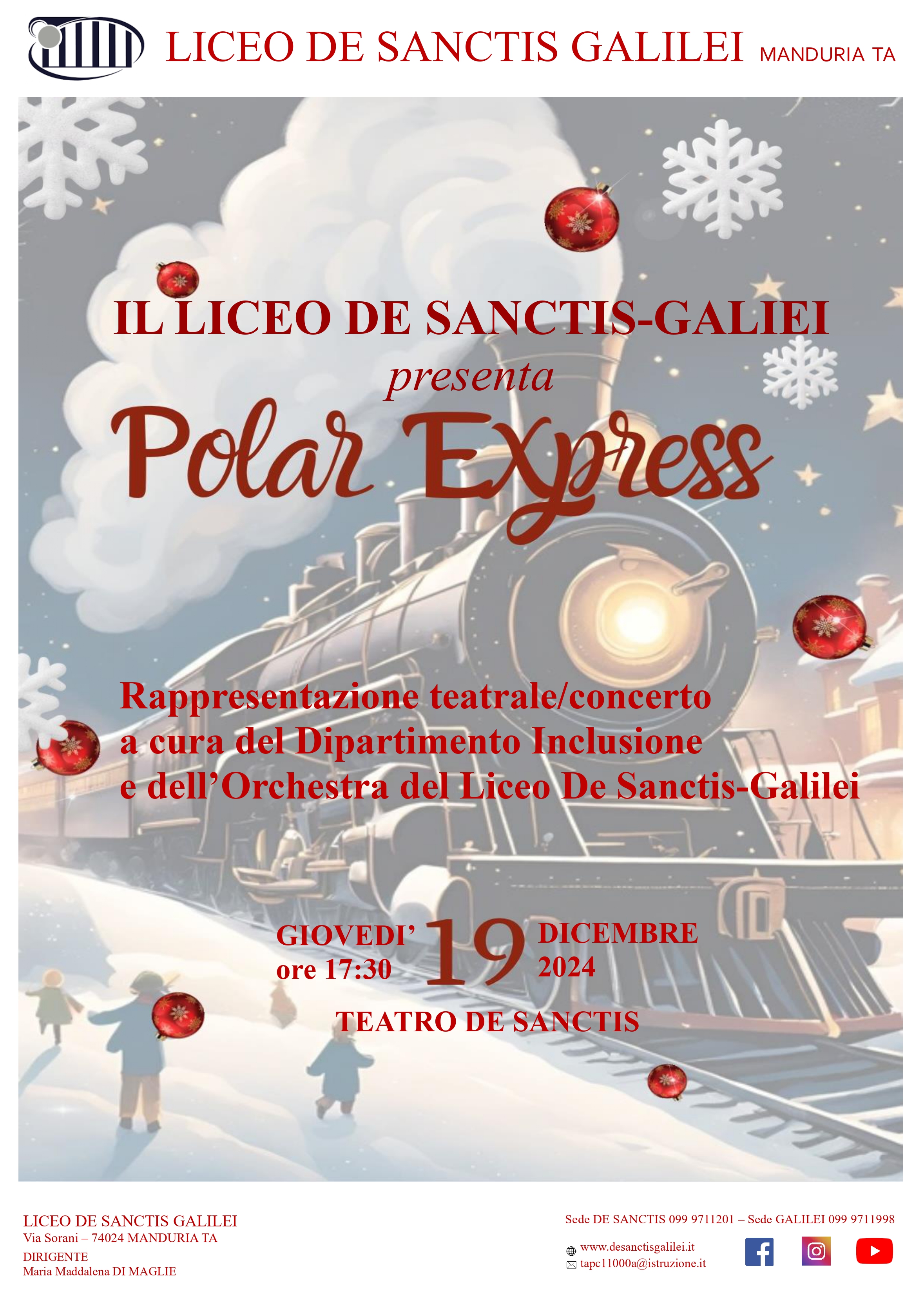 “Molto più di un semplice evento natalizio, questo spettacolo è il frutto dell’impegno e della creatività dei nostri studenti e docenti – commenta il dirigente scolastico Maria Maddalena Di Maglie - Polar Express ci ricorda l’importanza di credere nella bellezza dei sogni e della fantasia, valori che dobbiamo custodire e trasmettere, soprattutto in un periodo complesso come quello attuale. La scuola, attraverso l’arte e la musica, diventa un luogo di inclusione, condivisione e crescita, dove ogni studente trova il proprio spazio per esprimersi e brillare. Invitiamo tutti, famiglie e studenti, a lasciarsi trasportare dalla magia di questo viaggio unico, in cui la fantasia abbraccia la realtà e la magia del Natale diventa concreta. Perché, come ci ricorda Polar Express, “la vita è un viaggio, e l’importante è ciò che proviamo lungo il tragitto, senza perdere mai la capacità di stupirci”.