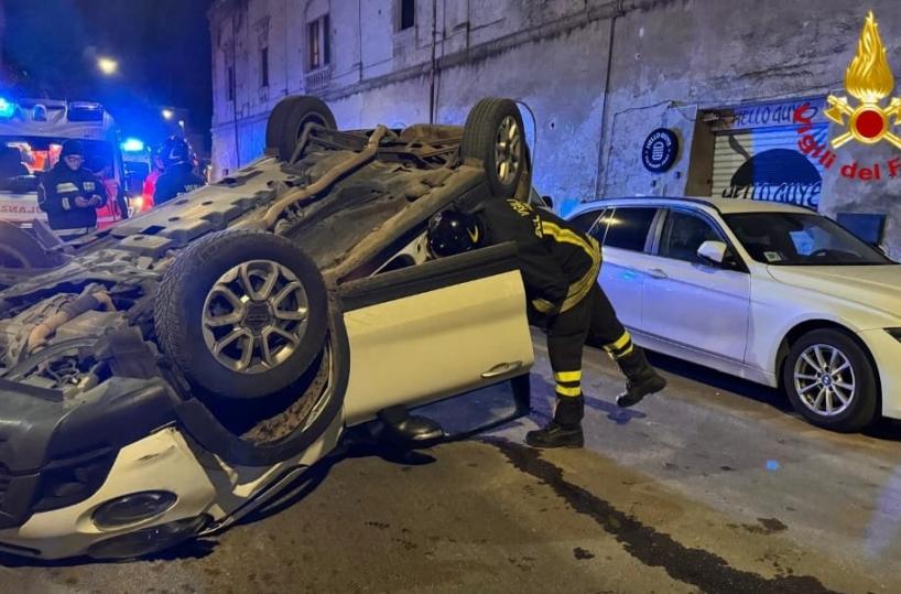Perde il controllo dell’auto, che prima sbatte contro un altro mezzo parcheggiato e poi si ribalta.