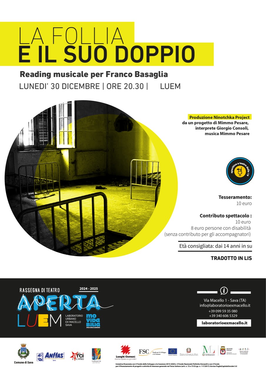 Nell’ambito della rassegna di teatro accessibili Aperta – aperitivo a teatro, promossa da Movidabilia, presso lo spazio teatrale del Laboratorio Urbano Ex Macello di Sava, si terrà lo spettacolo La Follia e il suo doppio – reading musicale per Franco Basaglia.