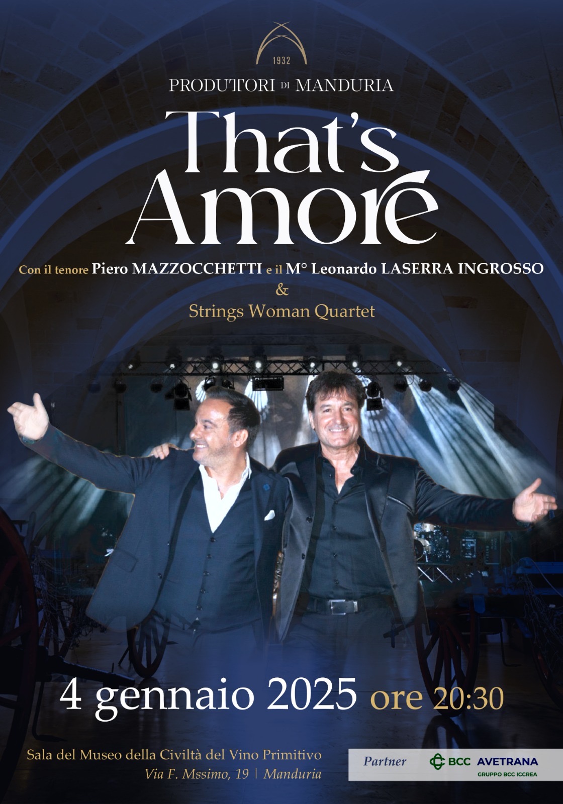 Sabato 4 gennaio alle ore 20:30 si terrà nella sala del Museo della Civiltà del Vino Primitivo, presso la Cantina Produttori Vini Manduria, il concerto “That’s Amore”.