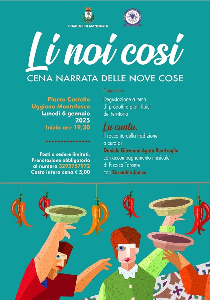 L’idea alla base dell’iniziativa, organizzata dal Gruppo Culturale Aracne di Uggiano Montefusco in collaborazione con l’Amministrazione comunale di Manduria, è quella di riproporre un’antica tradizione enogastronomica e religiosa della nostra comunità: la cosiddetta cena ti li noi cosi (la cena delle nove cose).