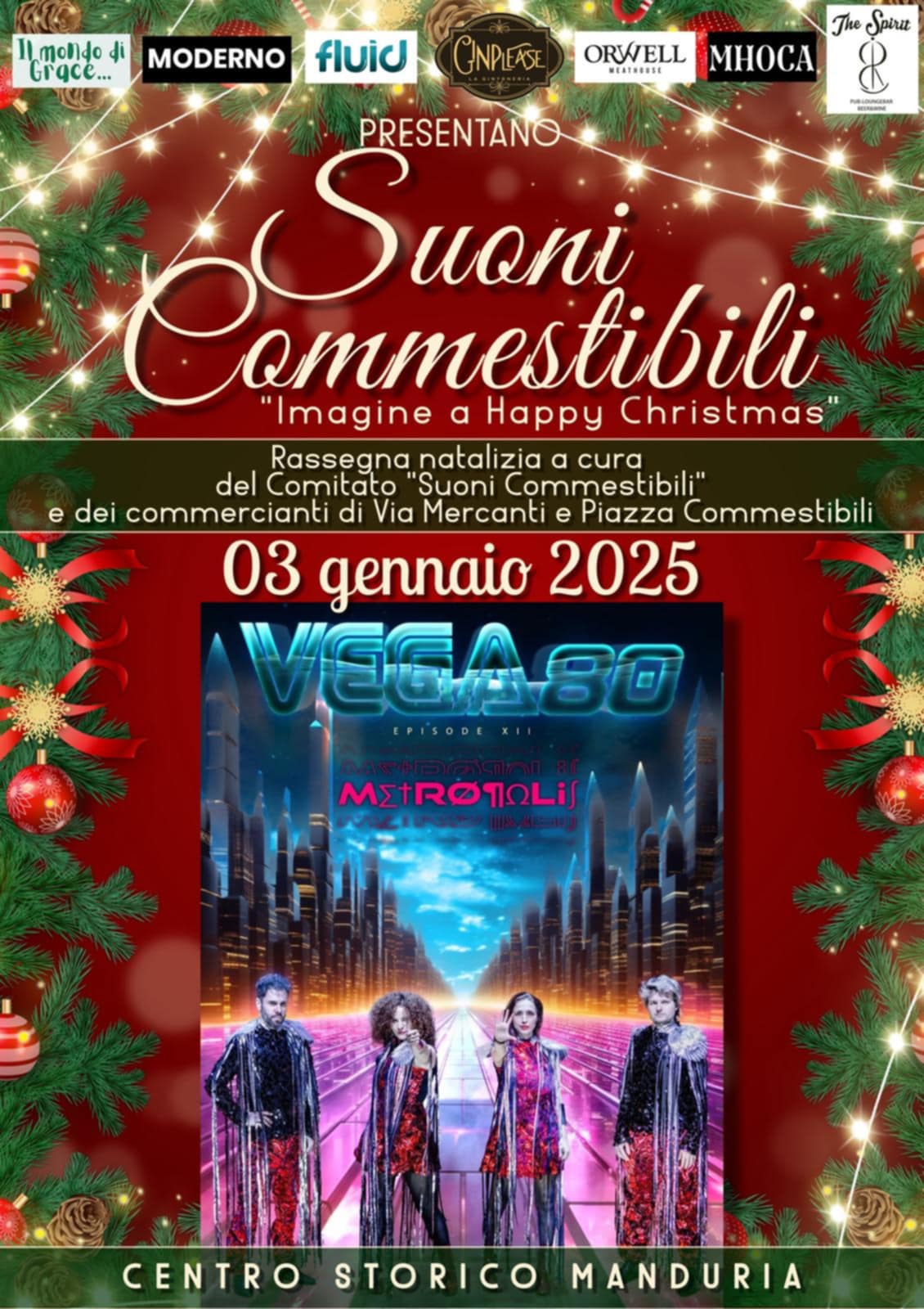 Venerdì 3 gennaio, alle 21.30, la rassegna natalizia “Suoni Commestibili” si concluderà in grande stile con un concerto imperdibile della band Vega 80, che si esibirà in piazza Commestibili.